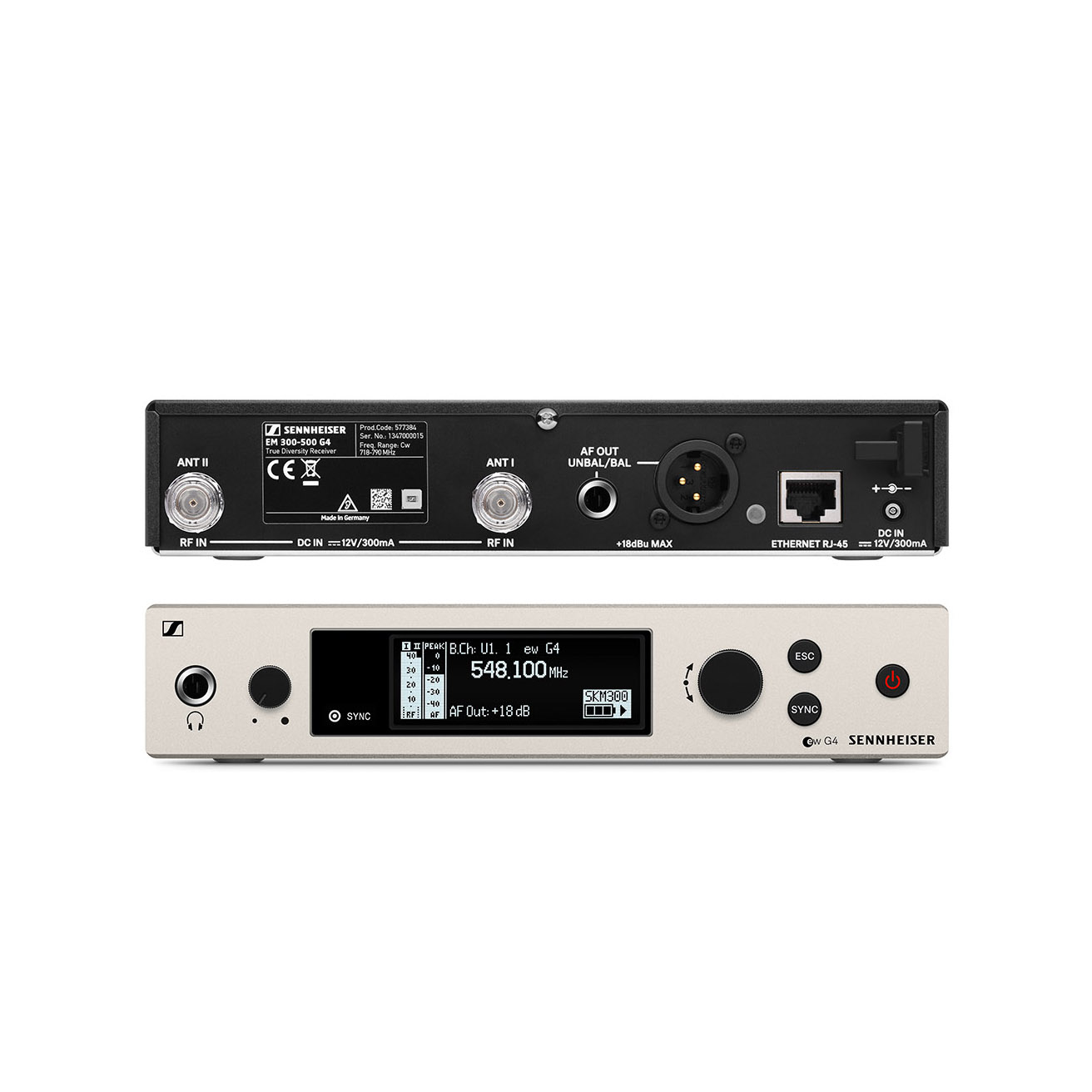 Wireless Handheld / bodypack combo base set. Includes (1) SKM 300 G4-S handheld microphone with mute switch (microphone capsule sold separately), (1) SK 300 G4-RC bodypack transmitter (lavalier, headmic or input cable sold separately), (1) EM 300-500 G4 rackmount receiver, (1) GA3 rack kit, and (1) mic clip, frequency range:BW (626 – 698 MHz)