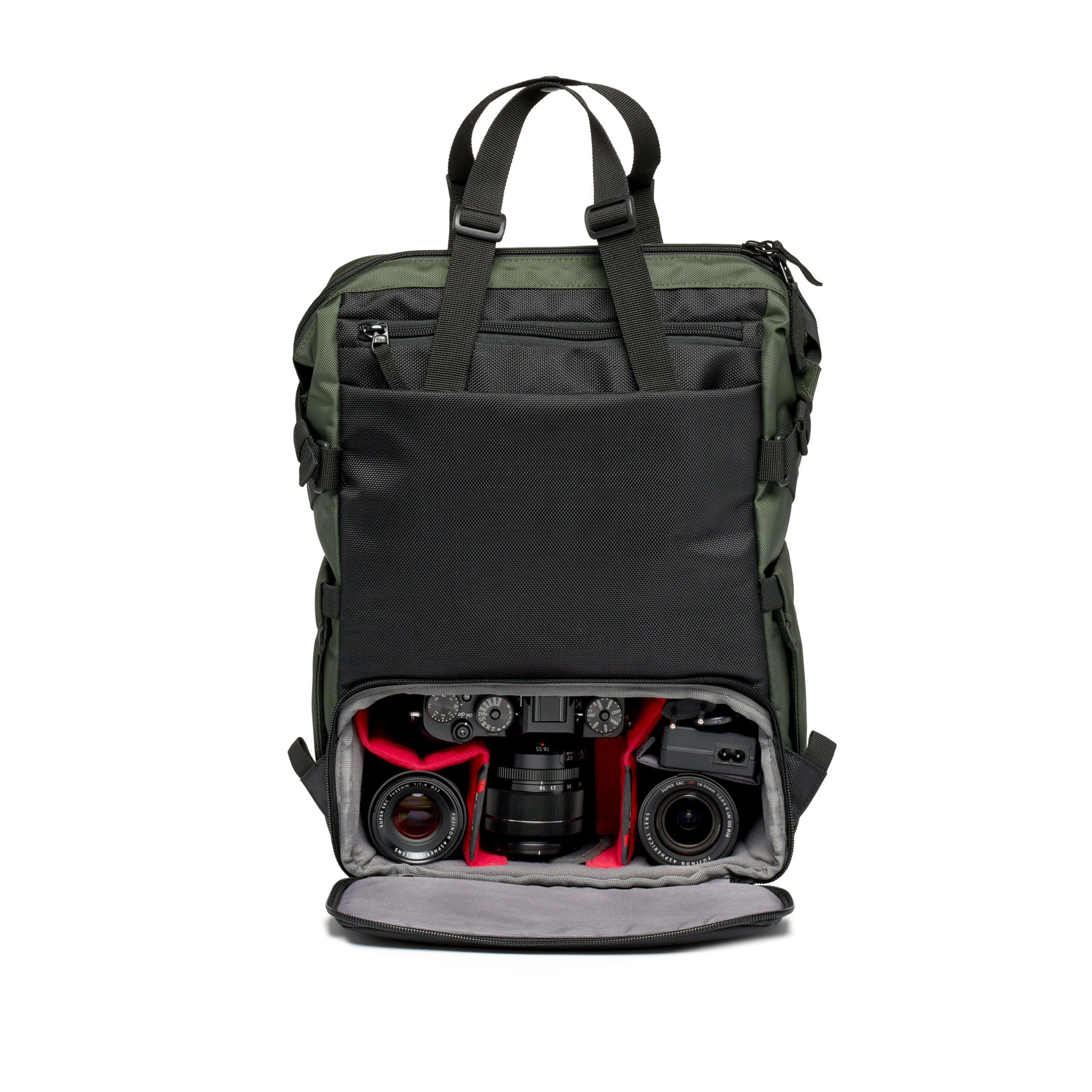 The bag also features a side tripod attachement for a small size tripod on one side and a water bottle holder on the other. A convenient external pocket is positioned on the front in order to have essential items always within reach. The two shoulder straps, when in backpack mode, feature a smartphone holder and a small tripod attachment to always have your creator tools on hand.