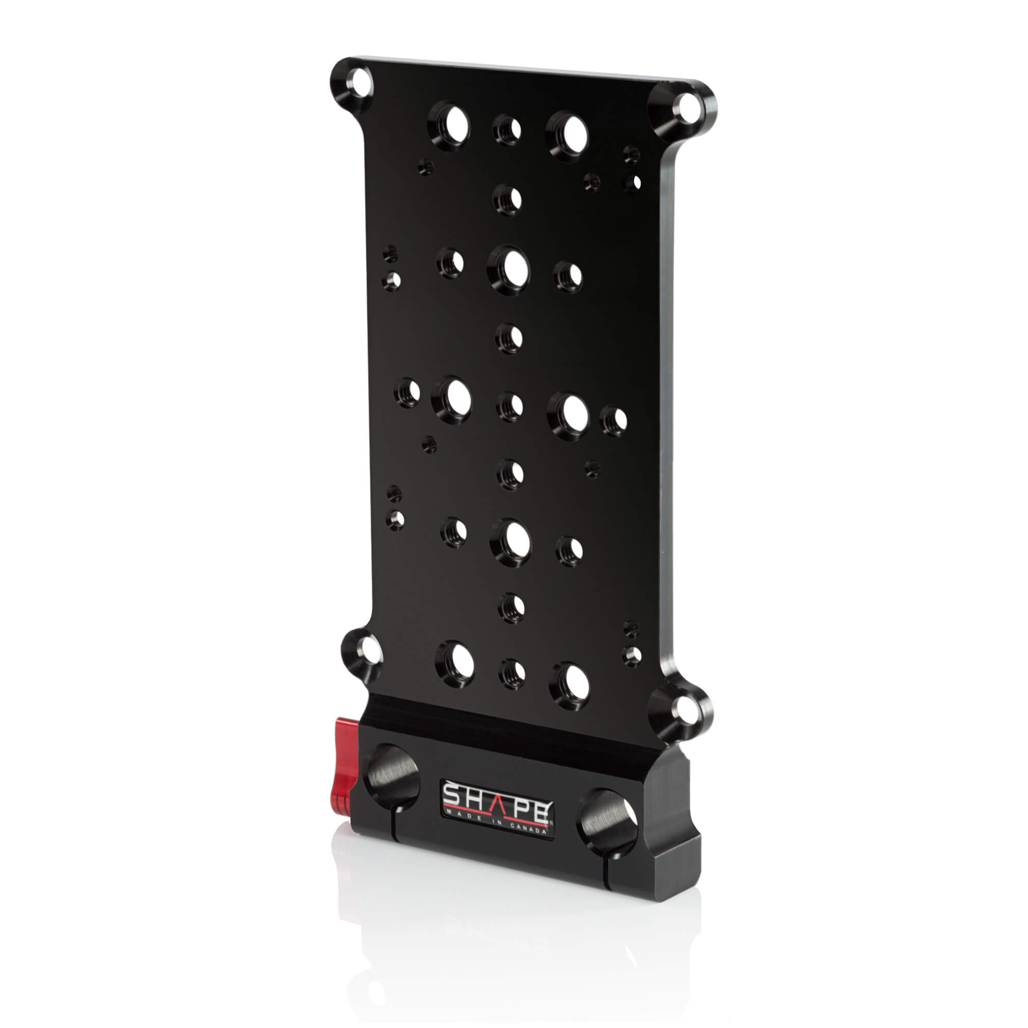 SHAPE’s CP33 Multi-Purpose Mounting Cheese Plate will let you add various accessories and devices to your camera rig. Just attach it to any two 15 mm rods on your rig, and you’ll have a total of thirty-three 1/4-“20, 3/8″-16, and 10/32″ threaded holes to work with. You can attach accessories to both the front, back and sides, and in some applications at the same time — for example, you can have a battery plate on the front side and an AJA Ki Pro-recorder on the back. The holes on the side are the 10/32″ holes. Four are available on each side for audio receiver brackets. Another great accessory you can attach is an articulating arm. You can actually attach a bunch of articulating arms, each pointing in a different direction. The plate is 1/4”-thick and is precision-machined into one whole, aluminum piece. It comes with sets of screws for attaching the Ki Pro, IDX battery plates and Anton Bauer battery plates. The SHAPE cheeseplate also includes (8) screws to mount the AJA Ki Pro Mini, (4) screws for the IDX plate and (4) screws for the Anton Bauer plate.