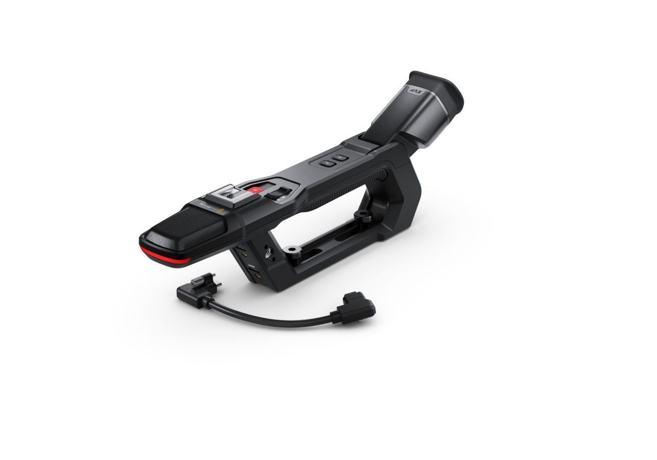 Professional handle for broadcast production with built in OLED viewfinder and precision glass optics, stereo microphone, record start/stop button and custom function buttons.