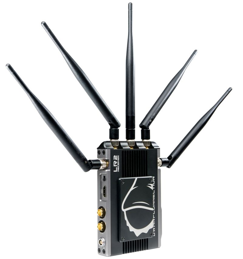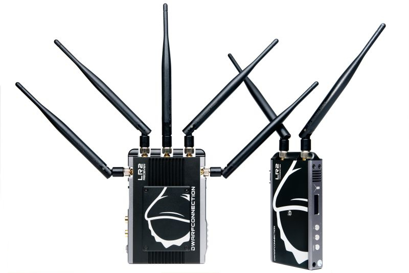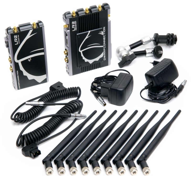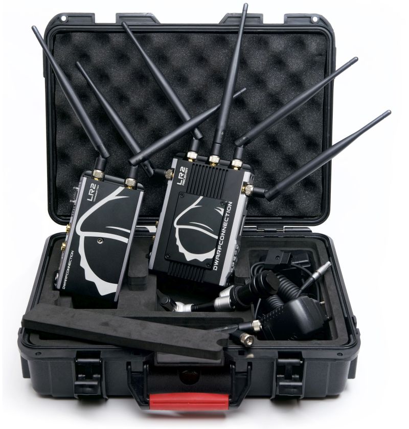 LR2, Videoradio with HDMI and SDI up to 700m based on WHDI technology. The DC-LINK-LR2 is a second generation video radio from DwarfConnection with a range of up to 700m in a direct view that brings numerous innovations with it. Of course the 2nd generation video radio systems are downward compatible and can be easily combined and expanded with the well known LR1 and CLR1 systems. To find the optimal channel, the LR2 has a frequency scanner and an antenna functioning monitor (DC-SCAN) wich can be used as an output via the HDMI port on the reciever. The wireless transmission of video signals and the frequency monitor can only be used alternately. The special stability of all DC-LINK video radio systems is achieved by deliberately avoiding DFS (Dynamic Frequency Selection). As a result the video radio can only be used on the channels provided for this purpose. The fans on the transmitter and reciever can be regulated as required or switched off completely. The OSD (on-scree-display) can also be switched on and off. An OLED display on the transmtiter and reciever provides information about the selected channels, the temperature and the charge level of the battery. Five large LED´s on the reciever indicate the reception quality even in bright surroundings. The LR2 video radio supports timecode and the transmission of start and stops signals and is one of the fastest of its kind when switching between camera image and recording.
