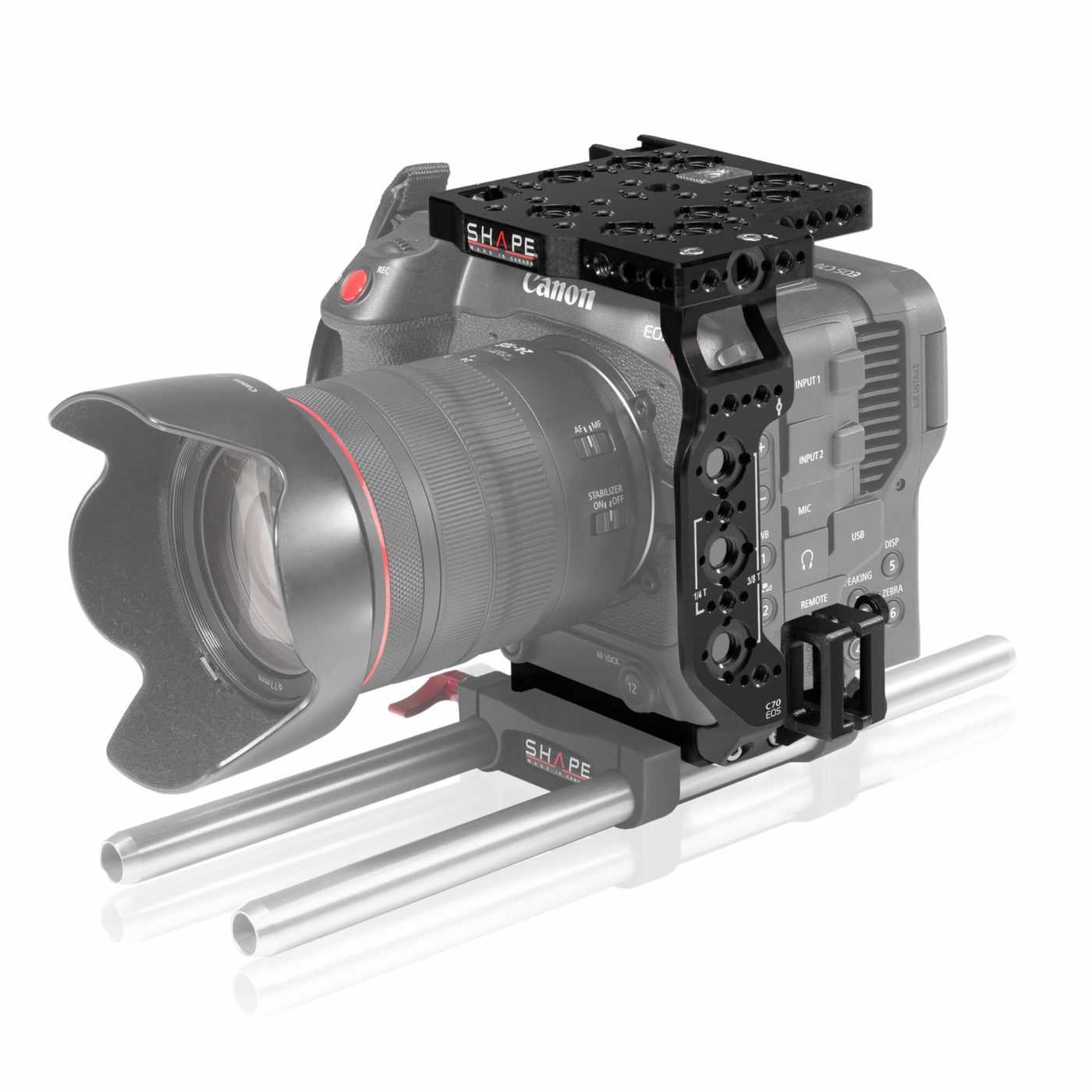 Add accessories and handheld functionality to your Canon C70 camera with this kit made of CNC aluminum. It includes a form fitting side plate, a top plate and the adaptor plate connecting together with the side post to protect your camera. The kit features several 1/4-20 and 3/8-16 threaded holes with ARRI standard anti rotating holes. The top plate is also designed to fit the factory Canon C70 top handle. An offset Cold Shoe fits perfectly the native microphones bracket of the camera. A detachable lock system to secure and hold in place your 4K FULL HDMI cable is included. The bottom of the plate features several 1/4?-20 and 3/8?-16 holes for mounting and balancing your camera on equipment like a tripod.