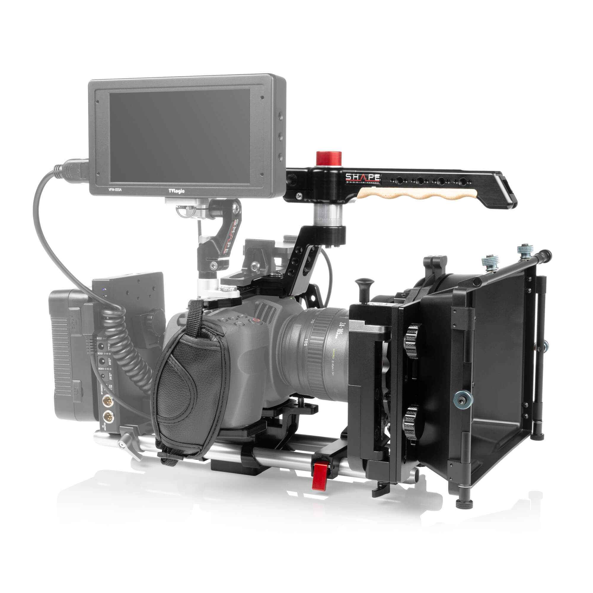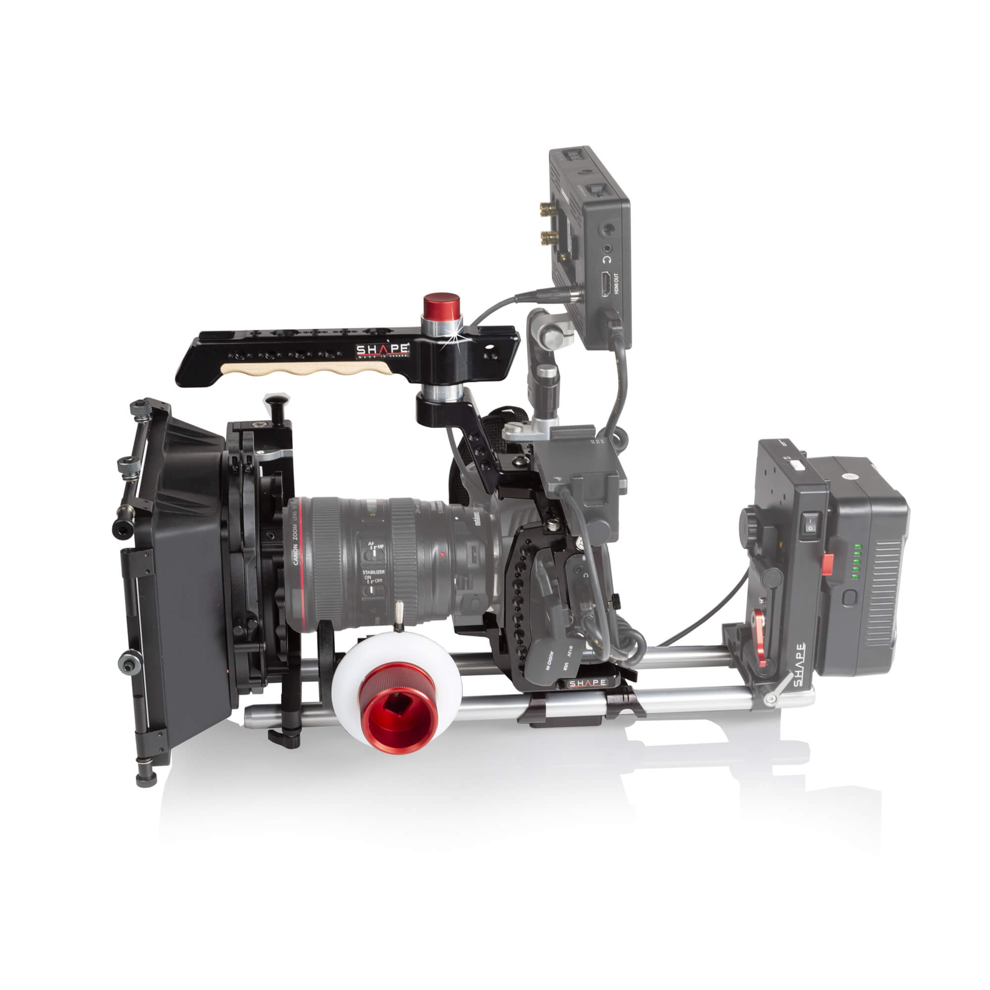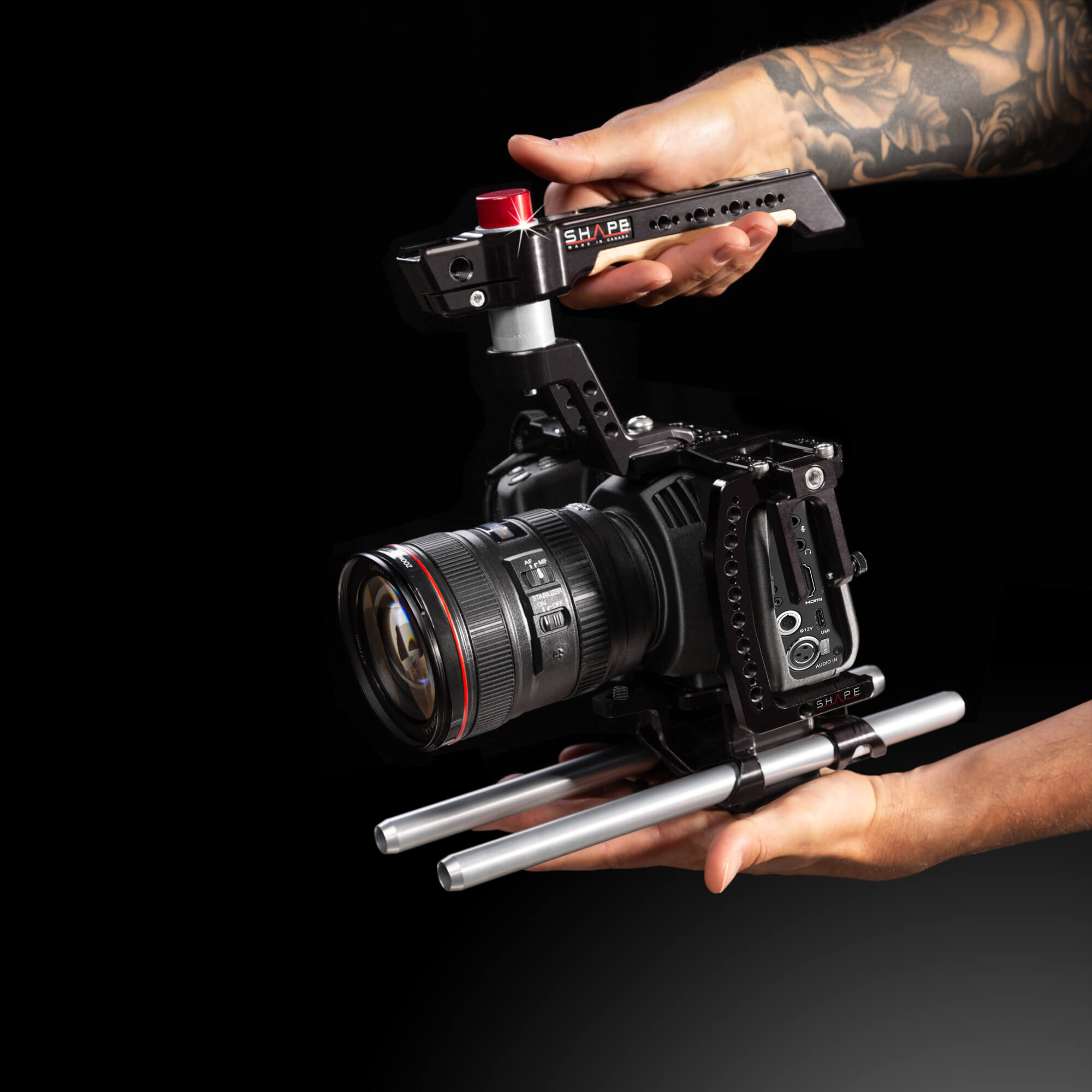 SHAPE is well known for its patented Push-button handle, now used by so many professionals in the industry. The technology was developped to give filmakers quick and easy adjustment. By simply pressing the button, you are allowed a 360-degree rotation to place the handle or top handle in the best position for your use. Push, adjust, release, and then its lock._x000D_
