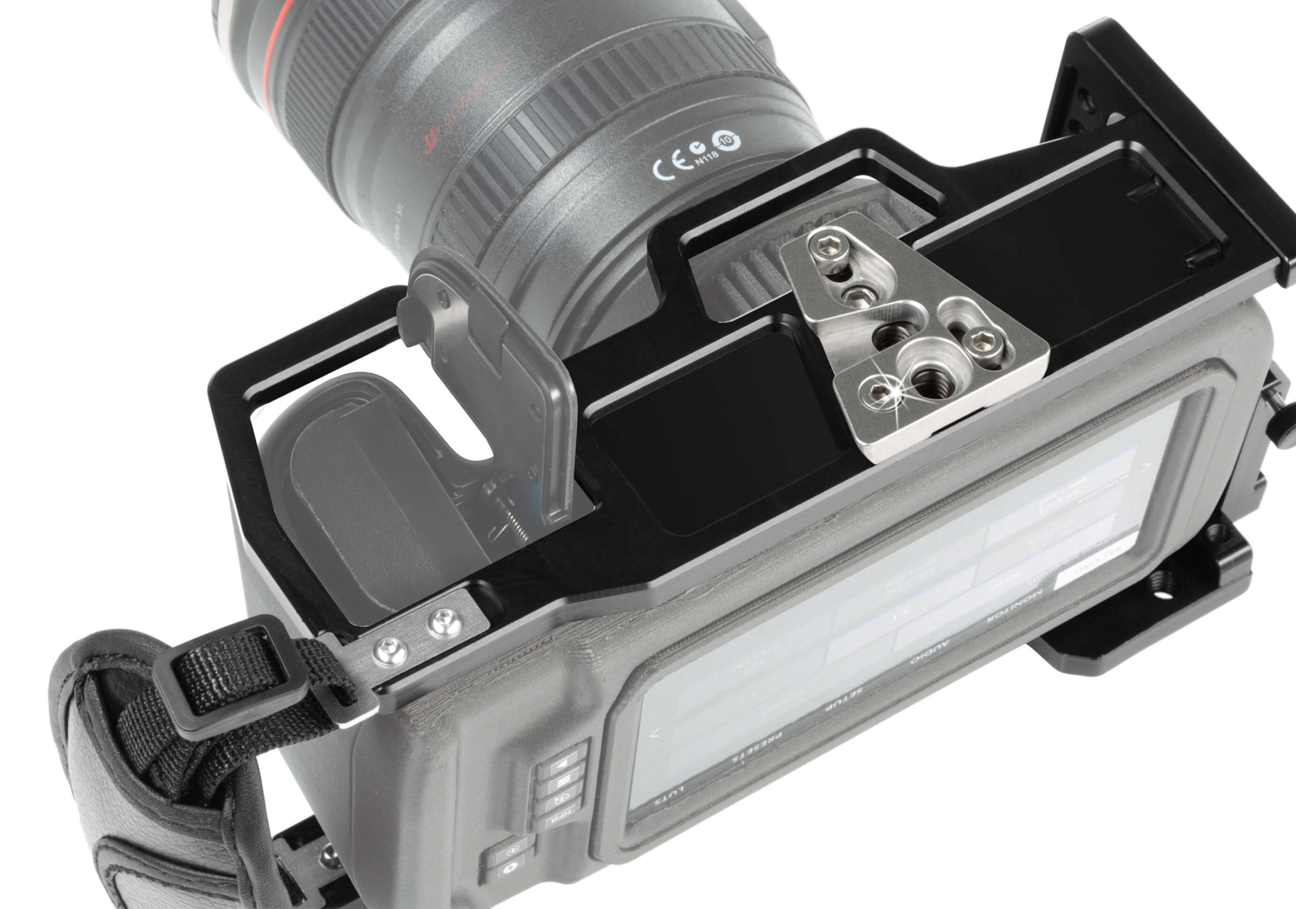 The Camera Cage for Blackmagic Cinema Camera 4K from SHAPE provides a formfitting base for attaching accessories, handles, or grips to your BMCC 4K. All controls, ports, and slots remain accessible when the cage is mounted to your Blackmagic Cinema Camera 4K. It gives you easy access to the memory card, the battery door, the lens release button and all other controls and outputs. The cage is designed with one cold shoe at the top to mount accessories like a microphone, magic arm (RPB2AHS), LED or Top Handle (DTH1). There is also multiple 1/4″-20, 3/8″-16 threaded holes with ARRI anti-twist threads to strongly secure the camera and accessories in place. Constructed from lightweight yet sturdy CNC-machined aluminum, the cage includes a left-side clamp to prevent your HDMI cable from accidentally disconnecting. A padded hand strap adds comfort when grasping the right side of the camera._x000D_