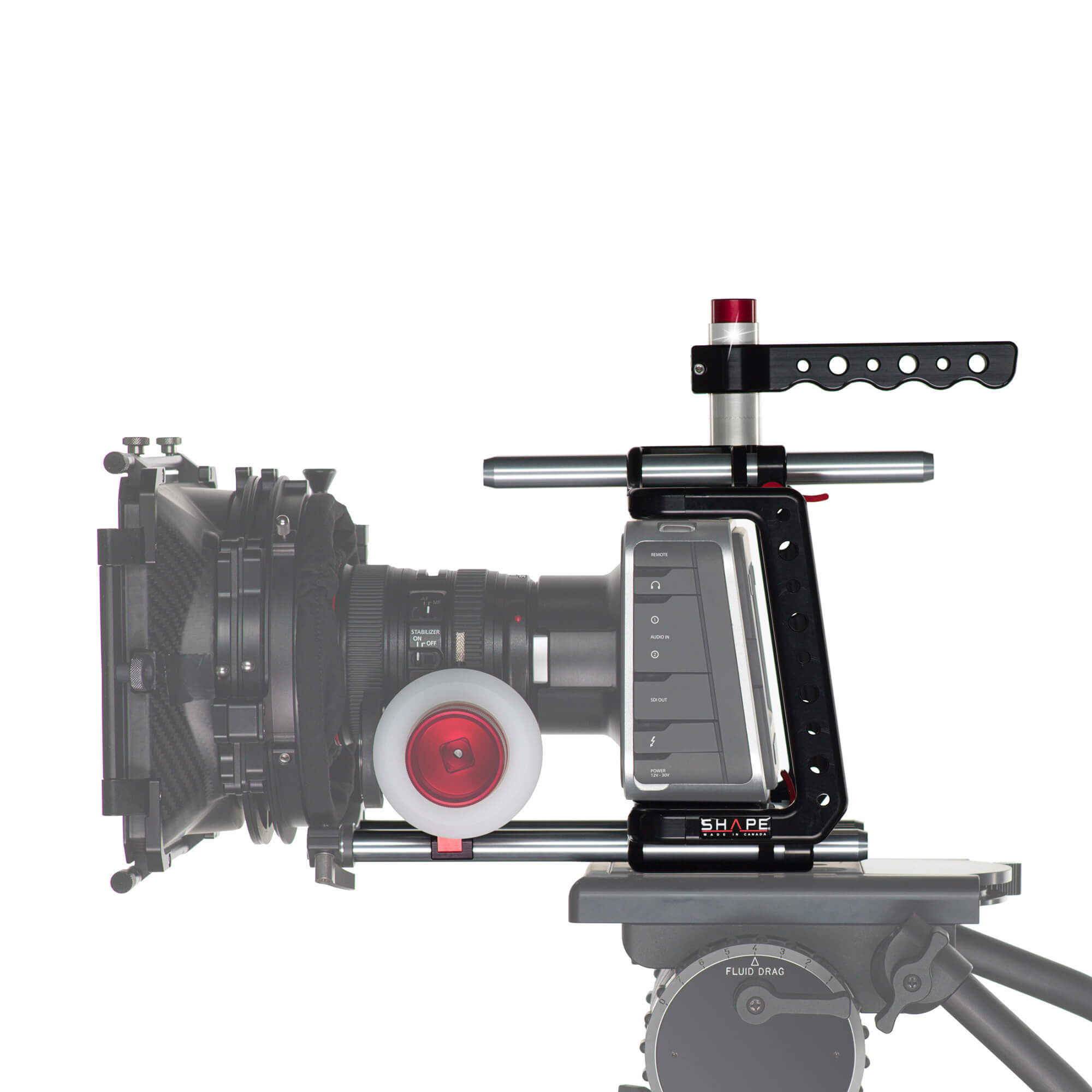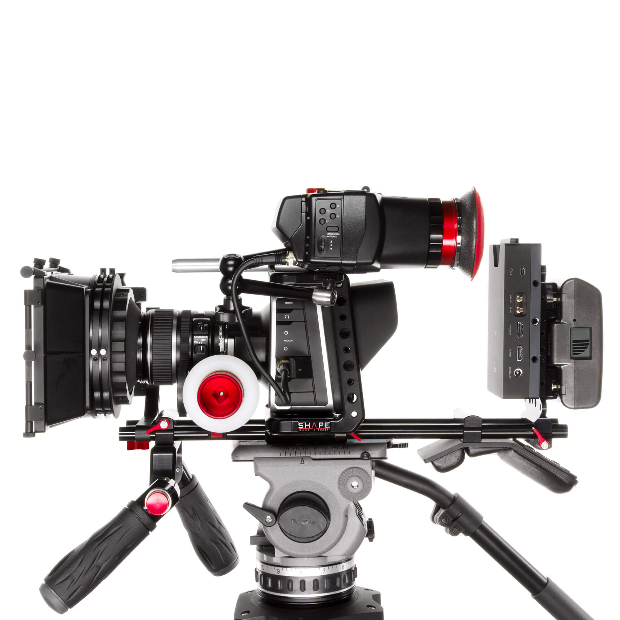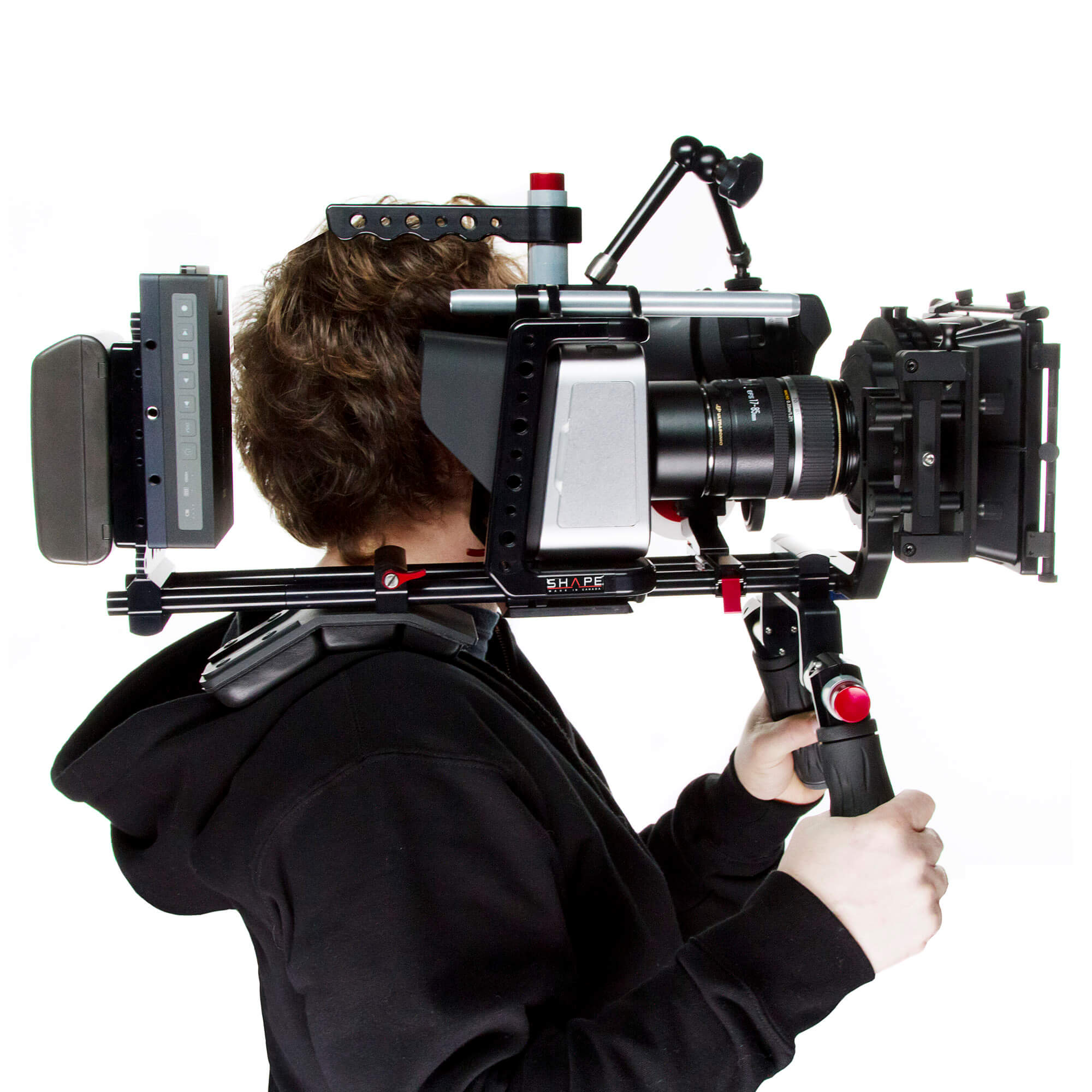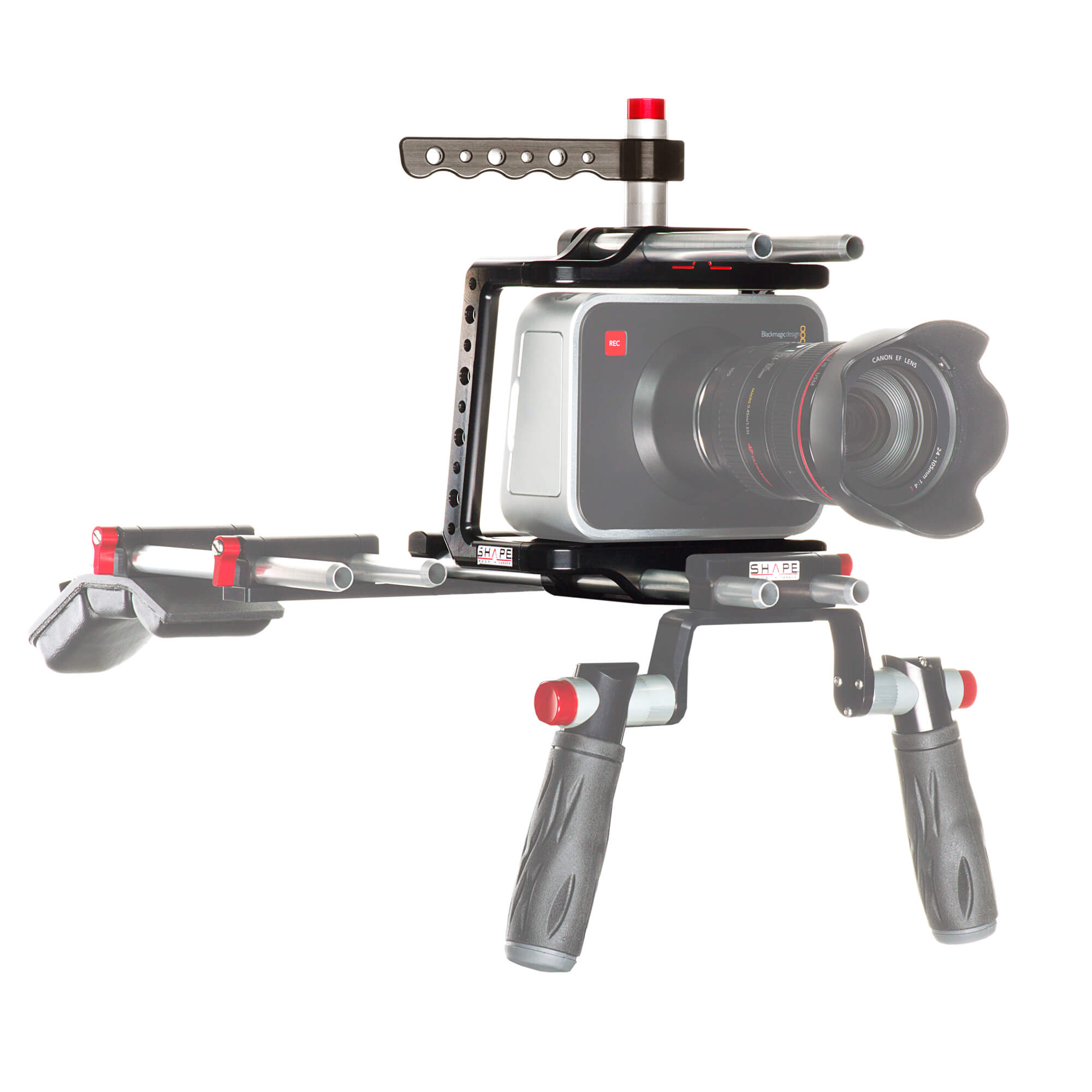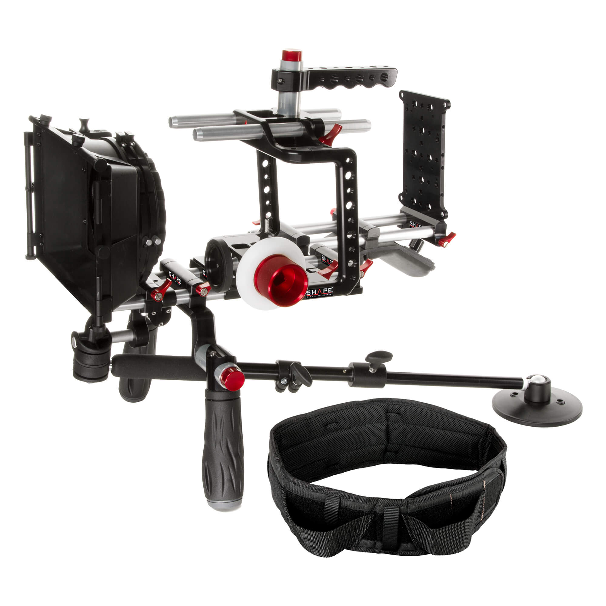 SHAPE’s Blackmagic Cinema Camera Shoulder Mount Offset Bundle is a 15 mm LWS shoulder-mountable cinema rig designed specifically for the Blackmagic Cinema Camera. The offset design allows you to comfortably monitor your shots and control the camera from its rear touch-screen LCD. The bundle features essential rig components, including a camera cage with 15 mm top and bottom rod support, follow focus, 2-stage matte box that accept 4×4″ filters, and a rod-mountable cheese plate useful for attaching a battery plate. For shoulder mounting, a compact shoulder pad is included, along with dual handgrips that features SHAPE’s push-button technology for quick angle adjustment. To reduce the weight of the rig on your shoulder and arms, this bundle also includes a telescopic support arm that connects to an included belt, serving to distribute some of the rig weight to your hips.