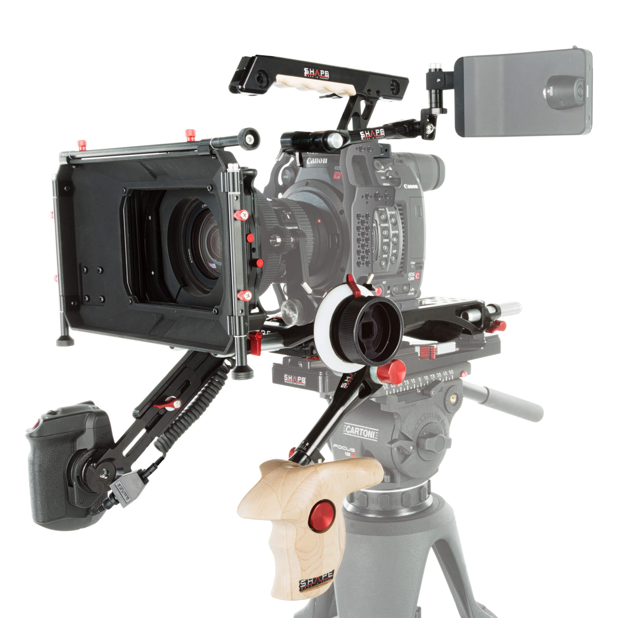 The SHAPE Canon C200 Camera Bundle Rig is a support system suitable for both handheld or shoulder-mounted shooting. It includes the BP0008 V-Lock Quick Release Baseplate with a pair each of 8″ and 4″ 15 mm aluminum rods, the V-Lock Replacement Pad, one HAND3 Telescopic Handle for ARRI Rosette, the Two-Stage 4 x 5.6″ Matte Box, and one Follow Focus Pro._x000D_