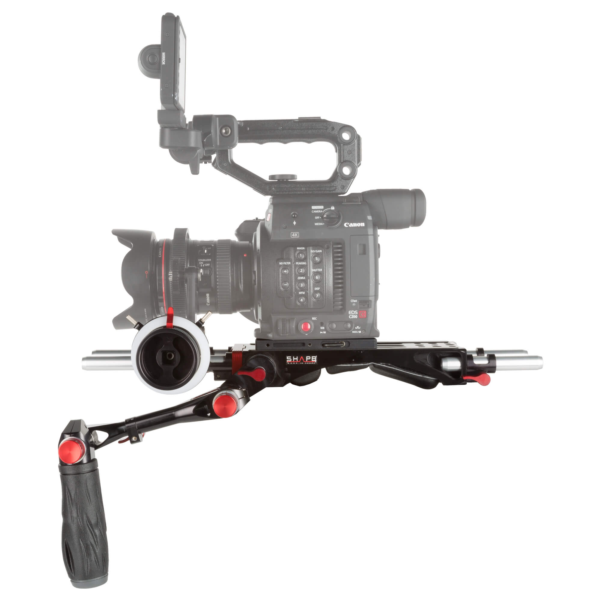 The SHAPE Canon C200 Camera Bundle Rig is a support system suitable for both handheld or shoulder-mounted shooting. It includes the BP0008 V-Lock Quick Release Baseplate with a pair each of 8″ and 4″ 15 mm aluminum rods, the V-Lock Replacement Pad, one HAND3 Telescopic Handle for ARRI Rosette, the Two-Stage 4 x 5.6″ Matte Box, and one Follow Focus Pro._x000D_