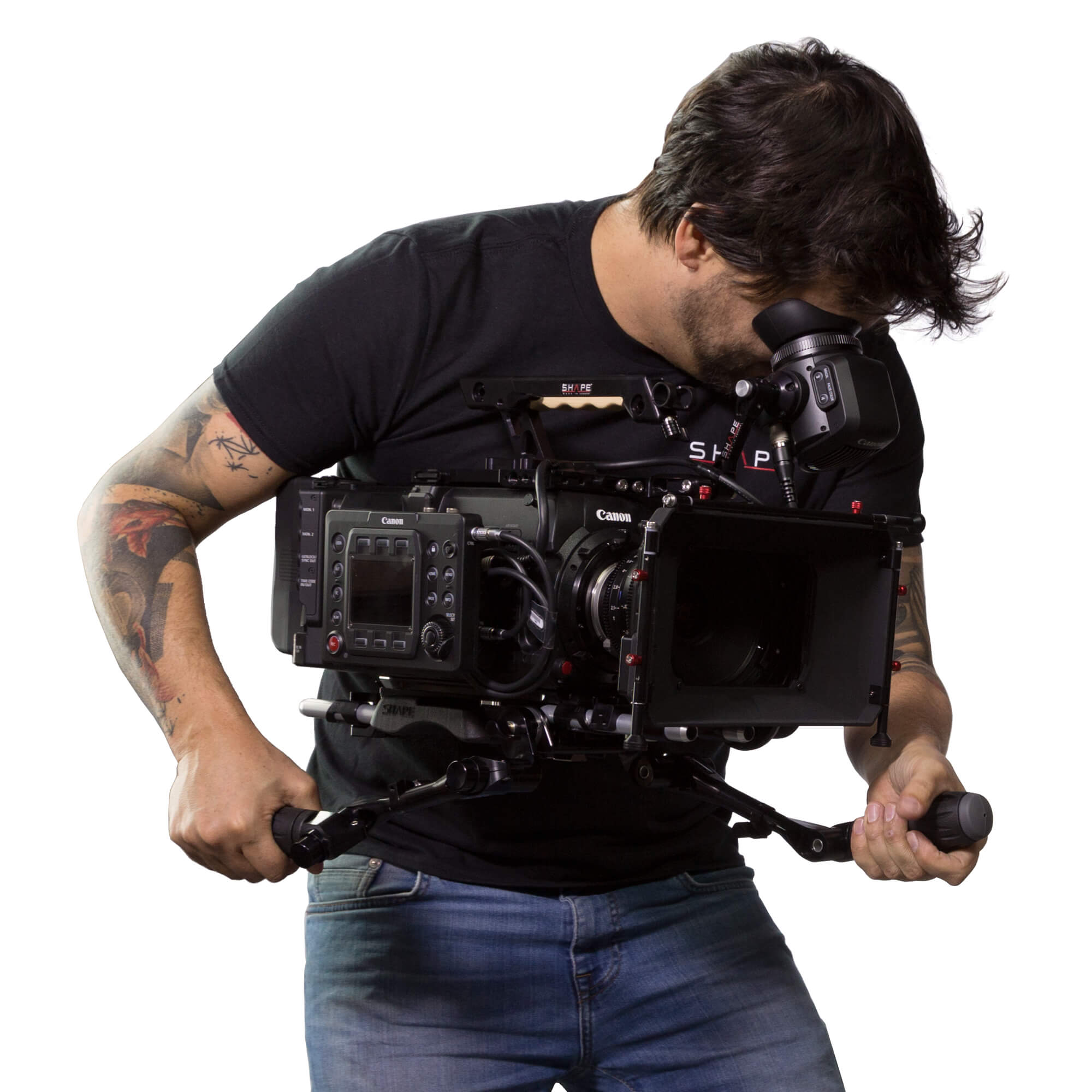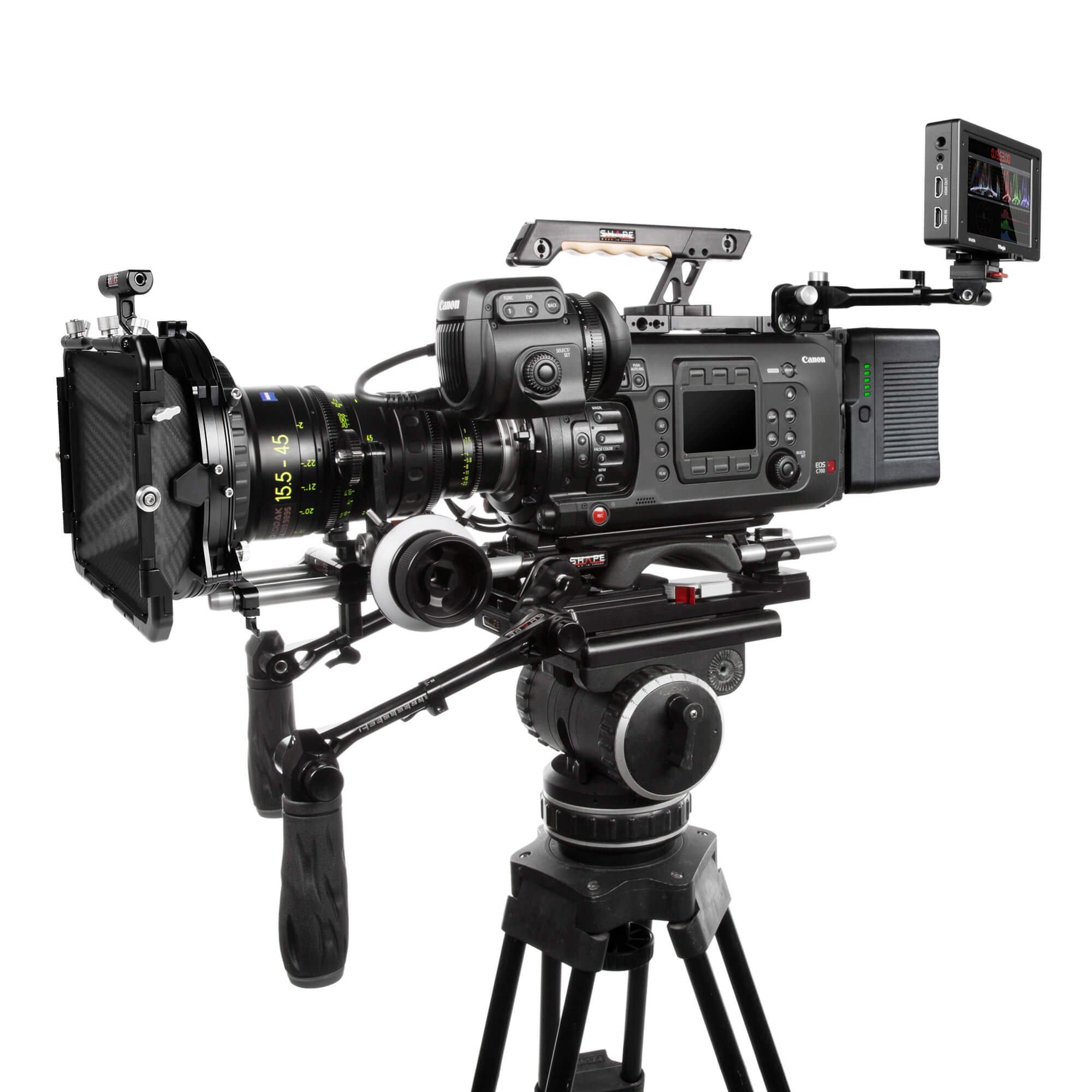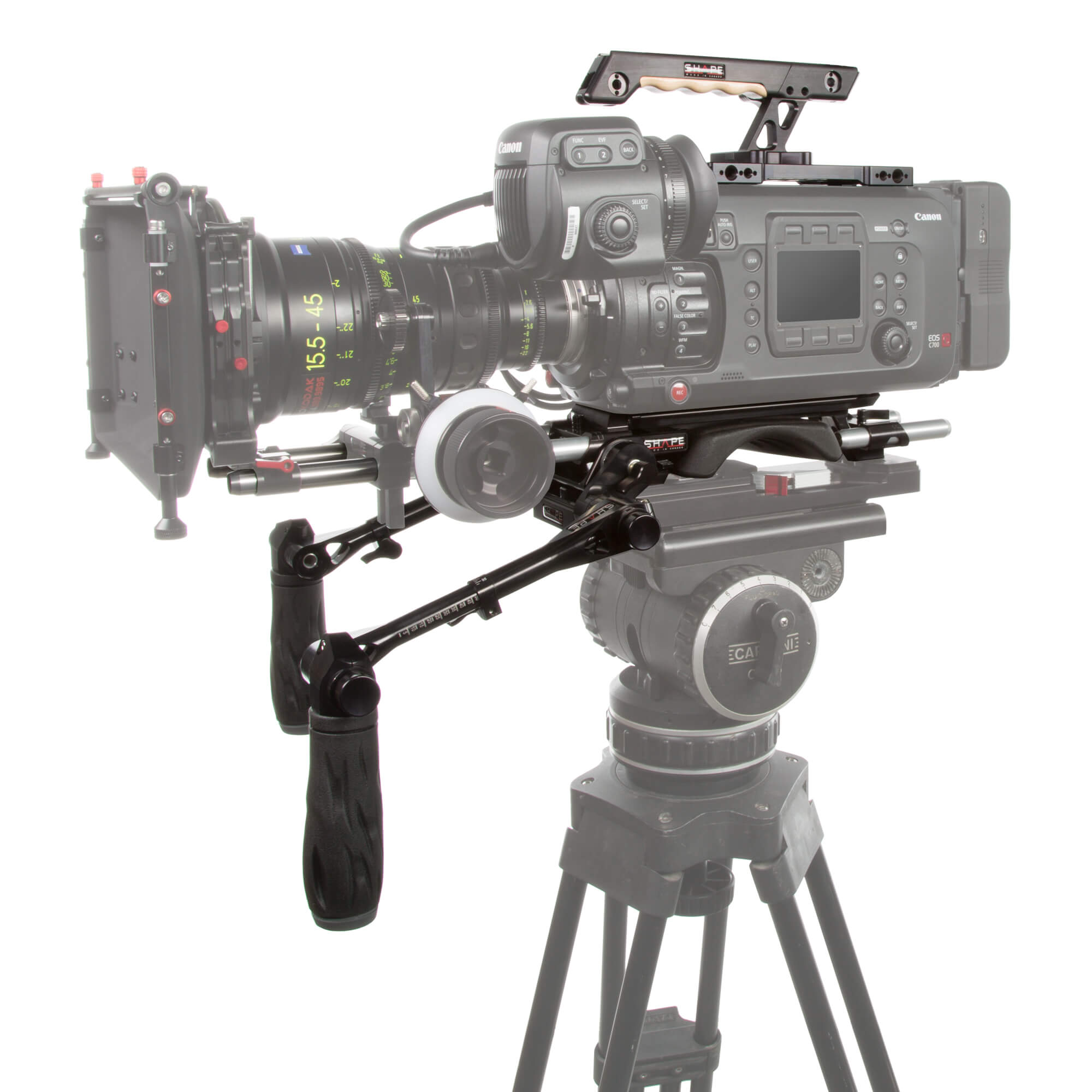The Complete Rig Solution from SHAPE is a camera support system designed for the Canon C700. It includes the REVOLT VCT Universal baseplate, a top plate with extendable top handle, a pair of telescopic handles compatible with ARRI rosettes, a 4 x 5.6″ matte box, and a snap-on follow focus unit. The follow focus snaps onto 15 mm rods, allowing for quick attachment, removal, and repositioning. The matte box features a swing-away system and two 4 x 5.6″ rotating filter stages._x000D_