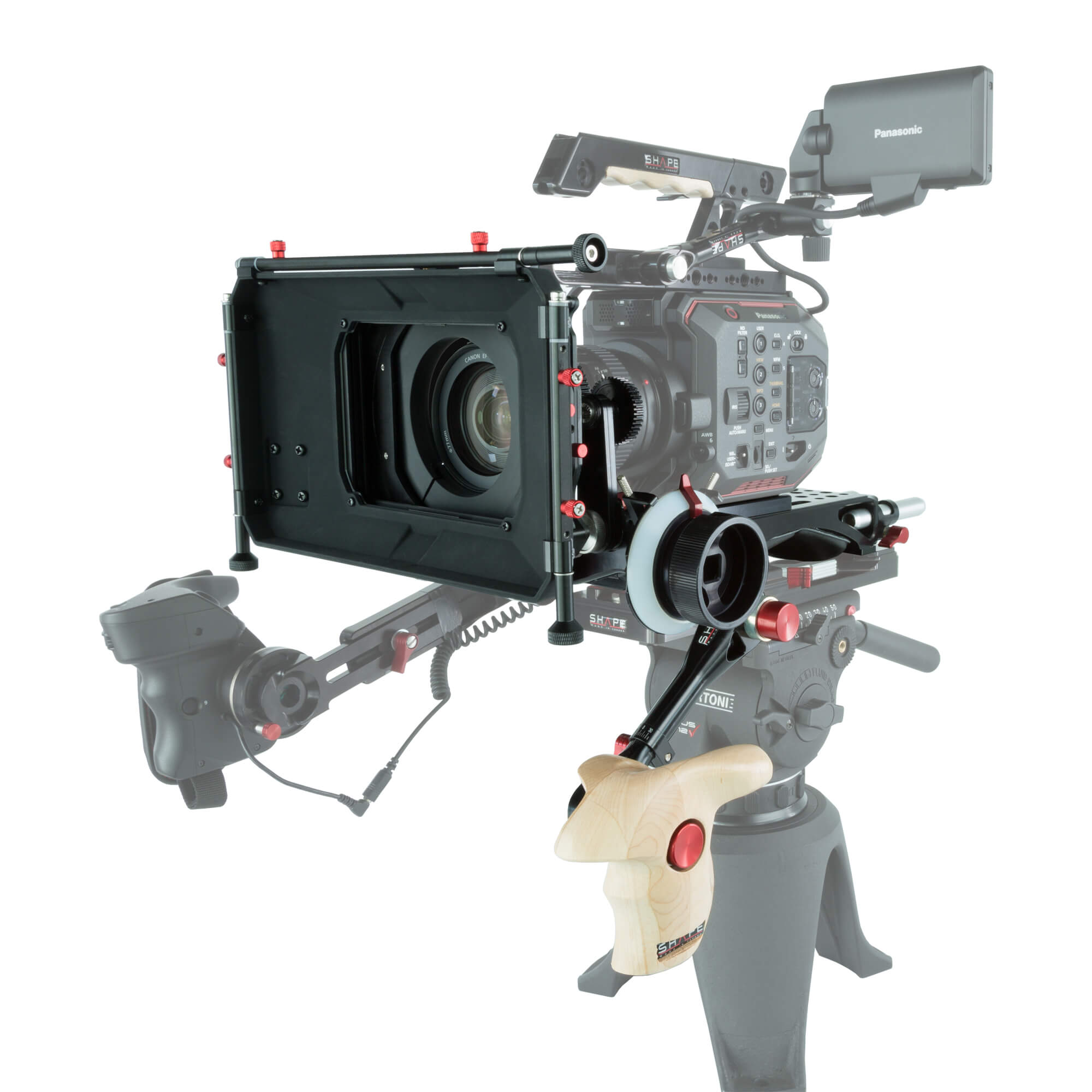 The SHAPE Bundle Rig is a camera support system designed for the Panasonic AU-EVA1 and is suitable for either handheld or shoulder-mounted shooting. It includes the BP0008 V-Lock Quick Release Baseplate, one V-lock replacement pad, a pair of telescopic handles with Push-Button, one two-stage 4×5.6″ matte box, one Follow Focus Pro, and a pair each 8″ and 4″ 15 mm aluminum rods._x000D_