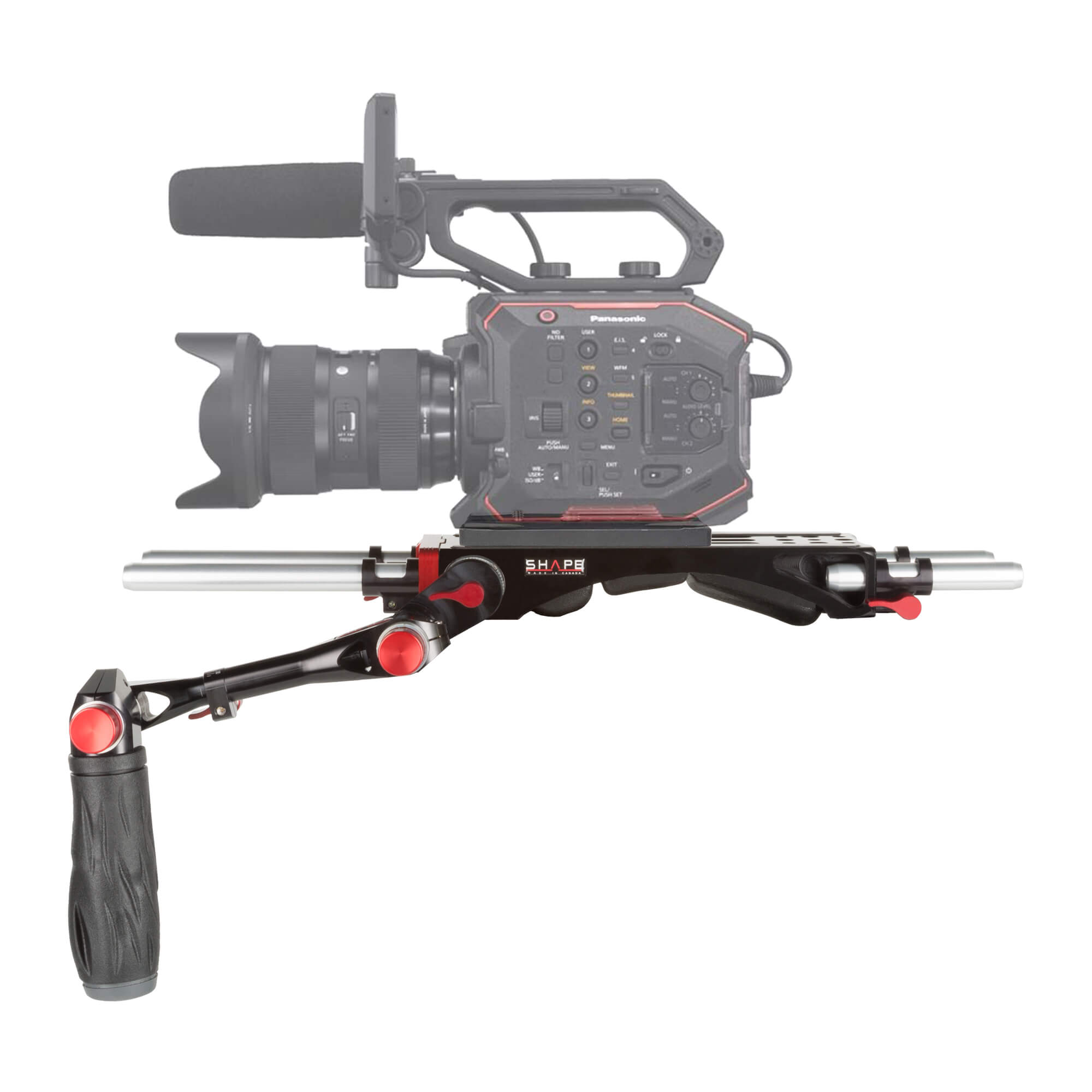 The SHAPE Bundle Rig for Panasonic AU-EVA1 is a camera support system designed for the AU-EVA1 and suitable for handheld or shoulder-mounted shooting. It includes the BP0008 V-Lock Quick Release Baseplate with 8″ and 4″ 15 mm rod pairs, the V-Lock Replacement Pad, and the HAND3 Telescopic Handle for ARRI rosette._x000D_