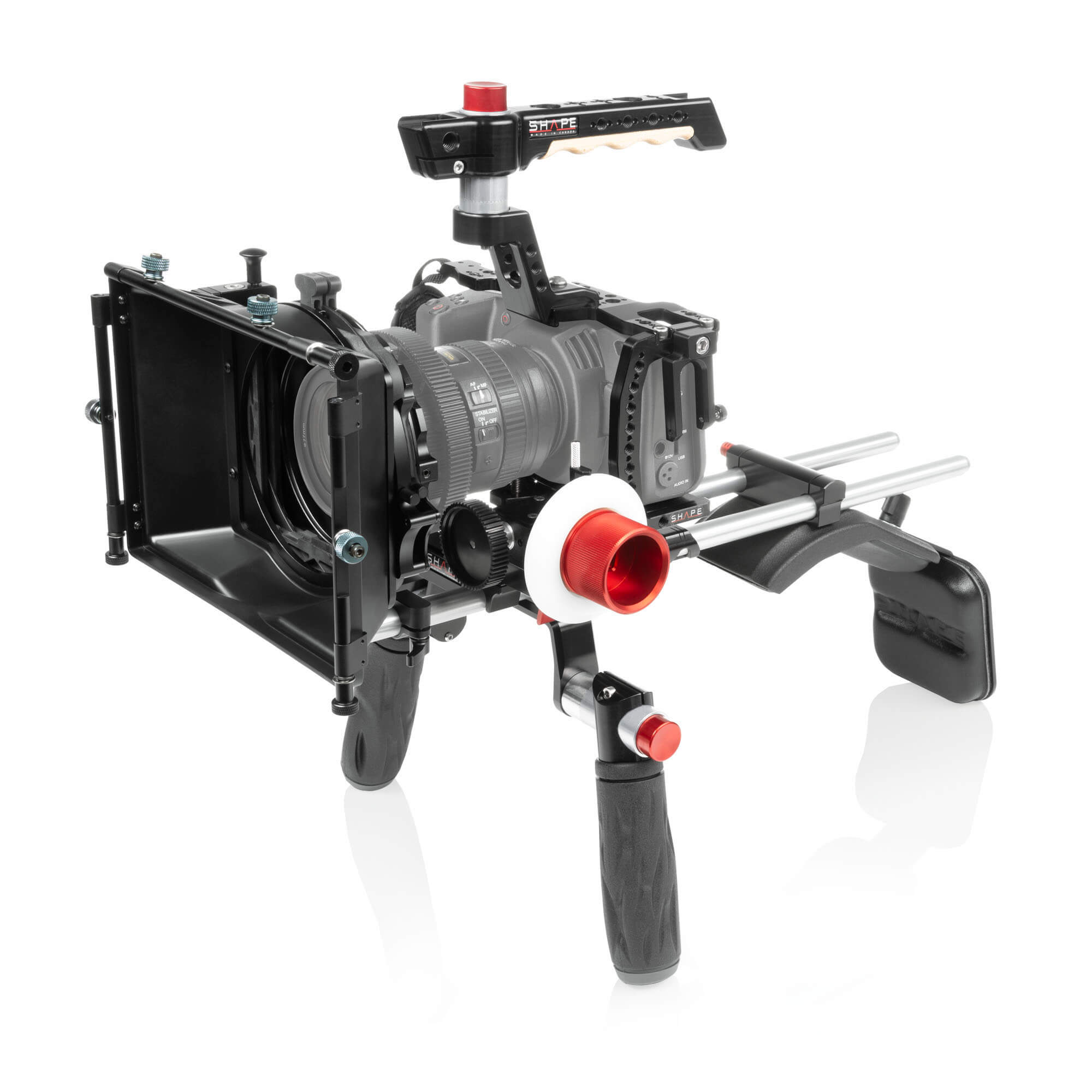 SHAPE is well known for its patented Push-button handle, now used by so many professionals in the industry. The technology was developped to give filmakers quick and easy adjustment. By simply pressing the button, you are allowed a 360-degree rotation to place the handle or top handle in the best position for your use. Push, adjust, release, and then its lock._x000D_