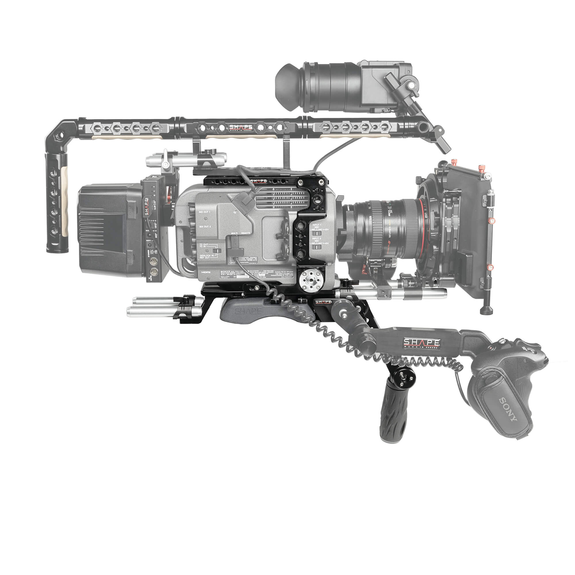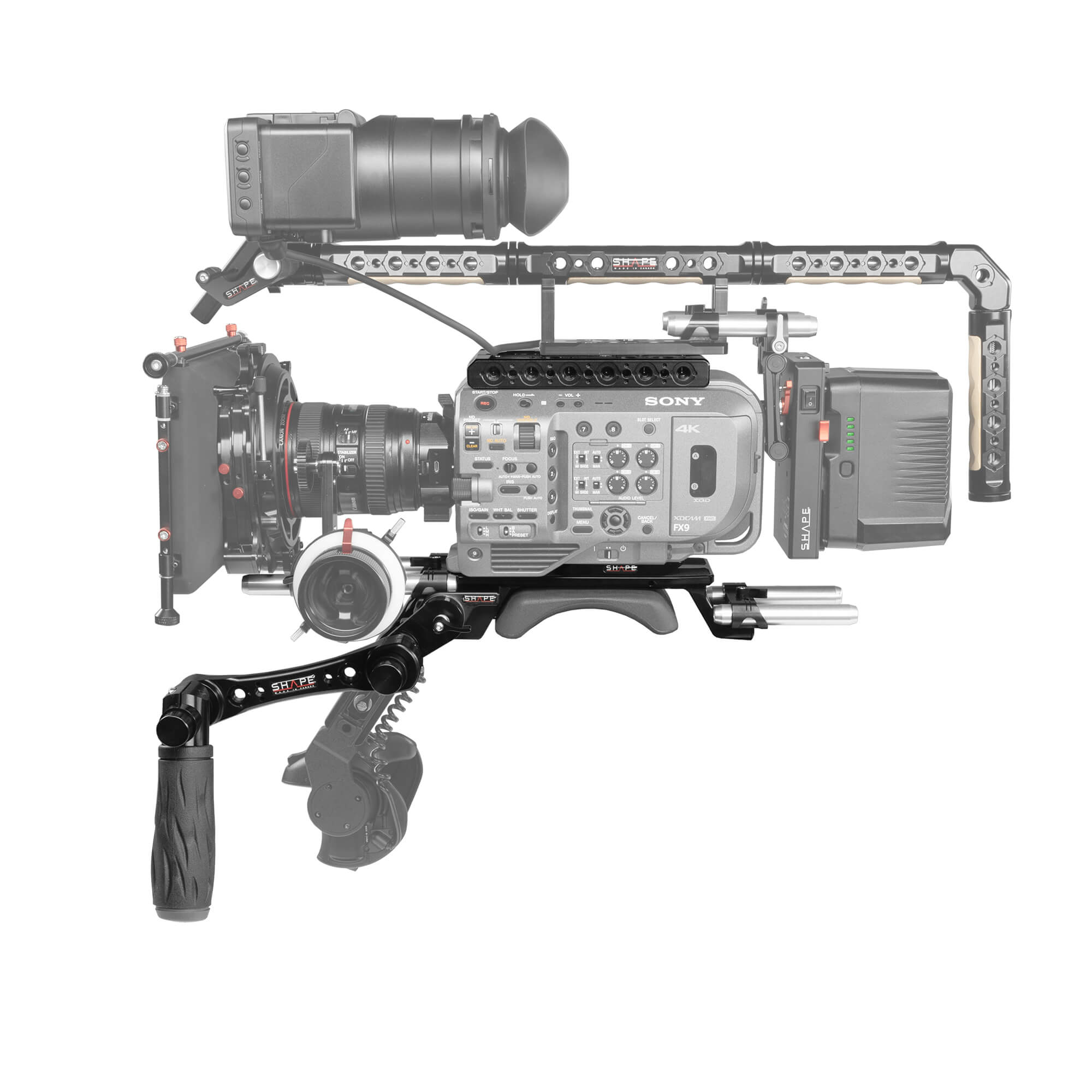 Add accessories and handheld functionality to your Sony PXW-FX9 camera with this Pro Shoulder Rig Kit from SHAPE. This kit includes a shoulder mount baseplate with 15mm rod system, a form fitting side plate with Arri rosette , a top plate, a rear insert plate, and a rosette handle with black push-button. The baseplate includes an integrated shoulder mount that allows you to convert your tripod-mounted camera into a handheld shoulder rig. The rear insert plate attaches to the rear of the camera to support it on the baseplate. The 15mm rods allow you to mount additional accessories like a matte box and follow focus. The push-button handle attaches to the baseplate and can rotate using the rosette joints for the most comfortable position._x000D_