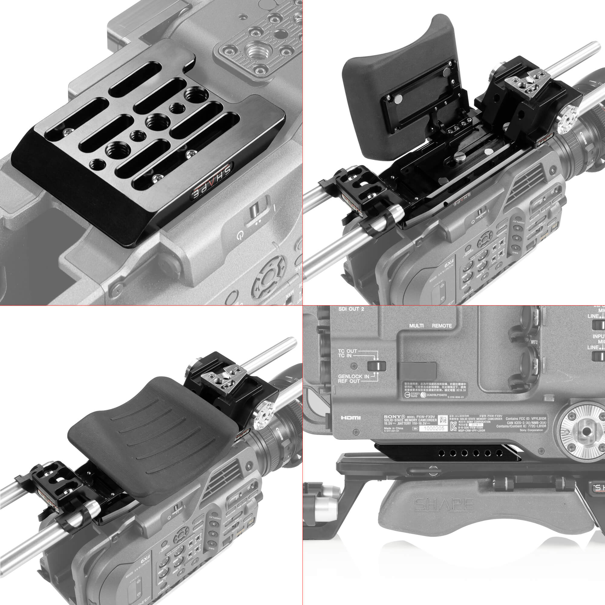 Add accessories and handheld functionality to your Sony PXW-FX9 camera with this kit made of CNC aluminum. It includes a form fitting side plate with Arri rosette , a top plate and a rear insert plate connecting together to protect your camera. The kit features several 1/4-20 and 3/8-16 threaded holes with anti rotating holes. The top plate is also designed to fit the native Sony FX9 handle._x000D_