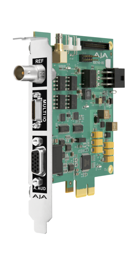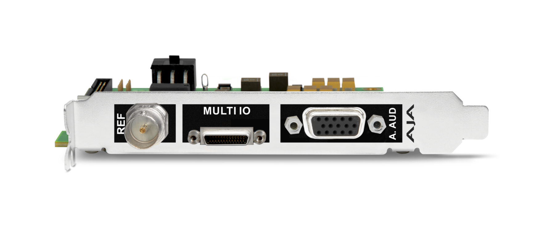 KONA Xpand is a PCIe card that expands the connectivity options on KONA X. It provides Bi-level/Tri-level Video Reference, as well as a 9-pin RS-422 connector for controlling a range of devices, 8-channels of unbalanced AES/EBU audio I/O, and LTC In/Out on the included breakout cable that ships with the KONA Xpand. Two channels of balanced analog audio I/O are also available (via a user supplied DB15 cable).