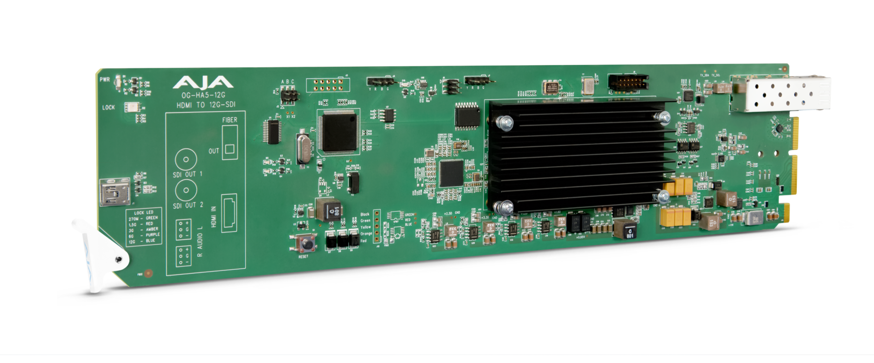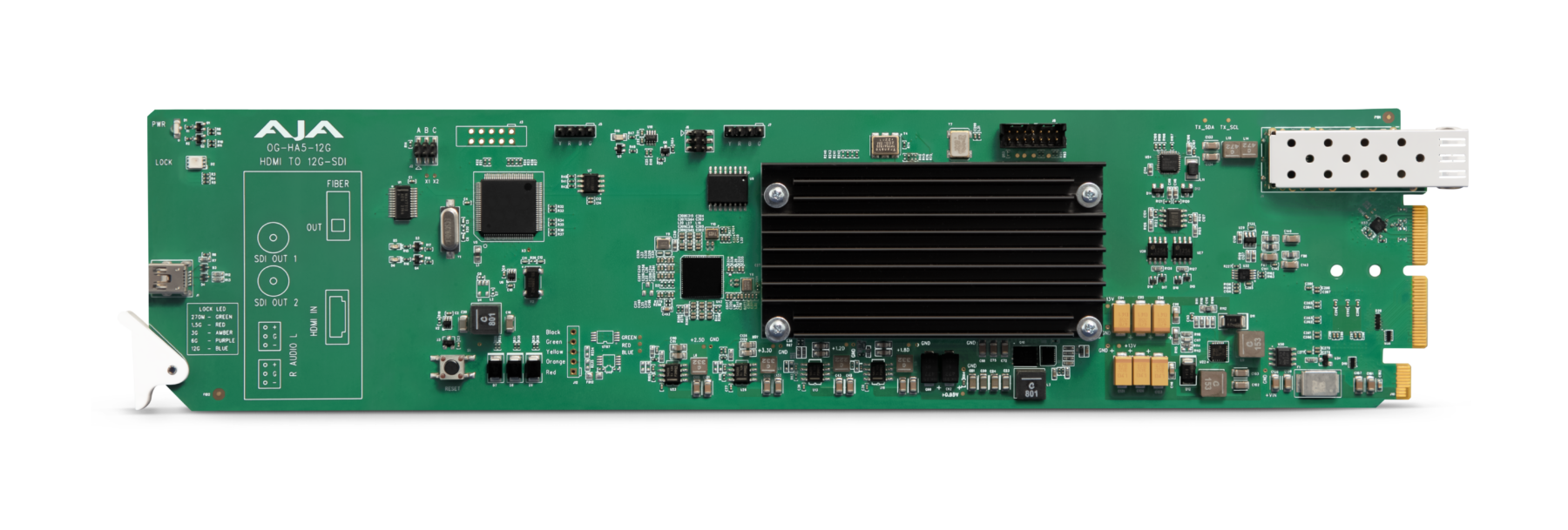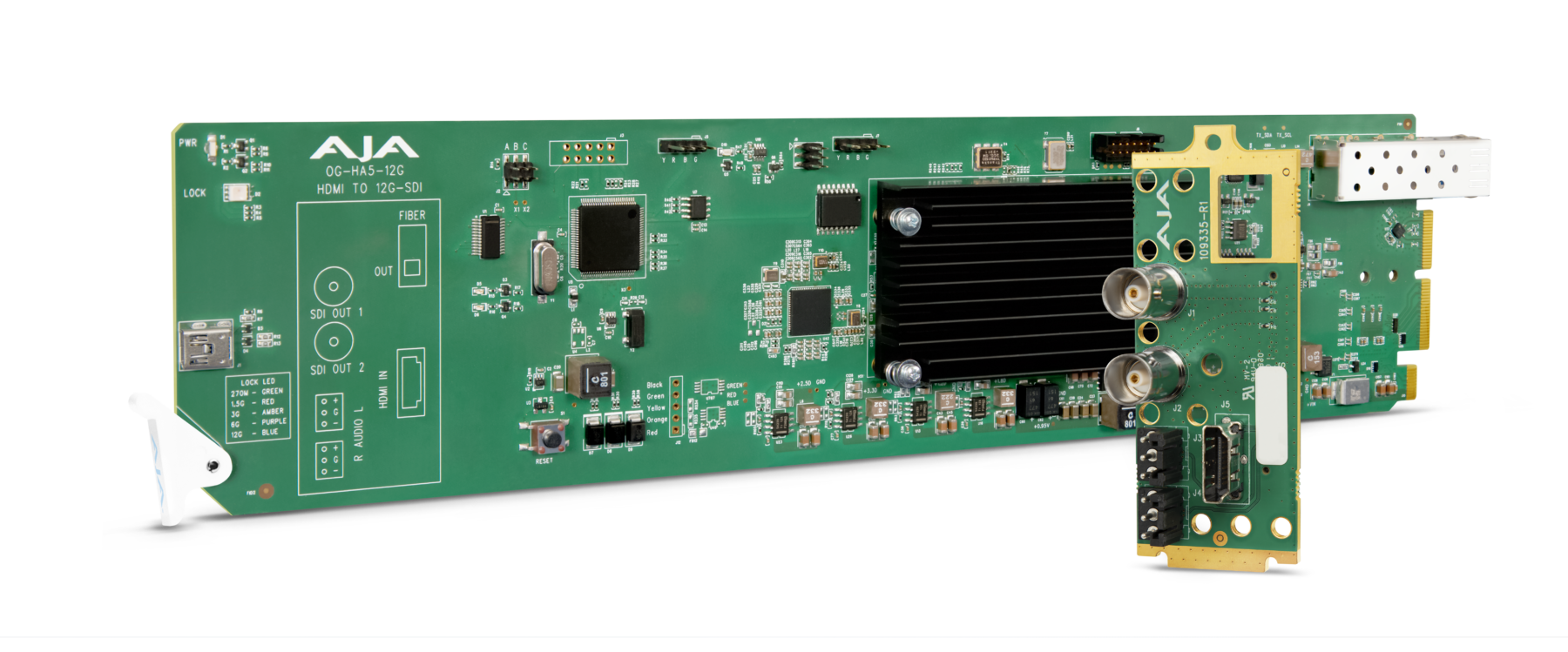 AJA’s OG-HA5-12G converts an HDMI 2.0 input to 12G-SDI for 4K/UltraHD single link outputs. OG-HA5-12G includes two 12G-SDI distribution amplifier outputs with 8 or 2-channels of embedded audio from an HDMI source.