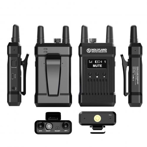 The Hollyland MARS T1000 is a full-duplex wireless intercom system with 1000′ line-of-sight transmission range. It includes a base station and four beltpacks. The base station powers from an included AC power adapter with 4-pin XLR connector or from optional L-series batteries via the dual-battery plate built into the top of the station.